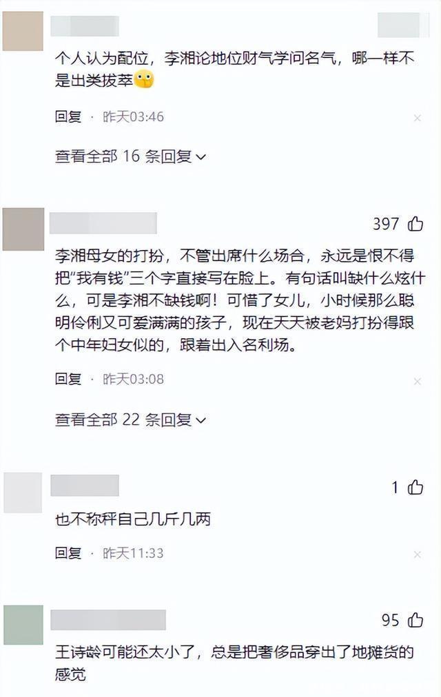 李湘带着时年16岁的王诗龄盛装出席,二人身着隆重礼服,佩戴着显眼的高级珠宝,手拎价值不菲的名牌手包。 这一情况本身就在清一色的商务着装中,显得格外突兀,但她仍然忙前忙后,积极为女儿引荐、合影。